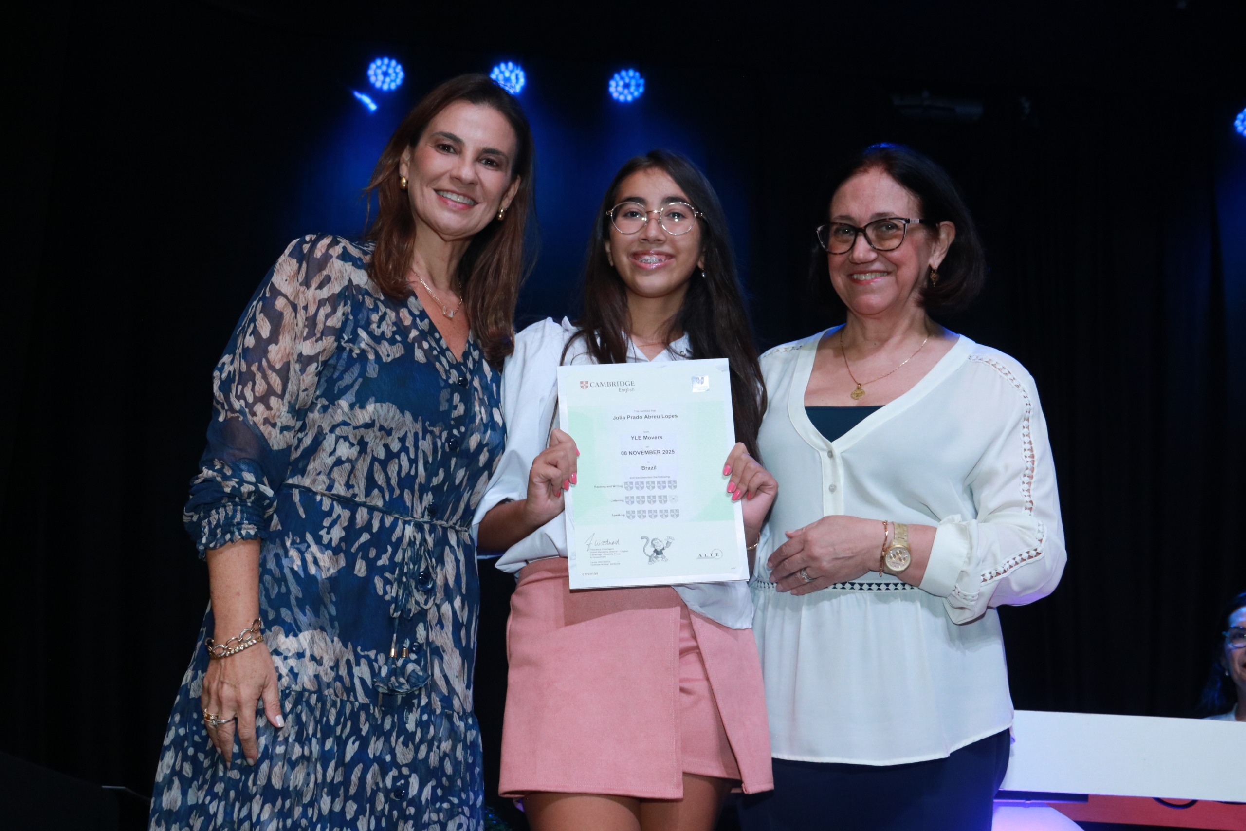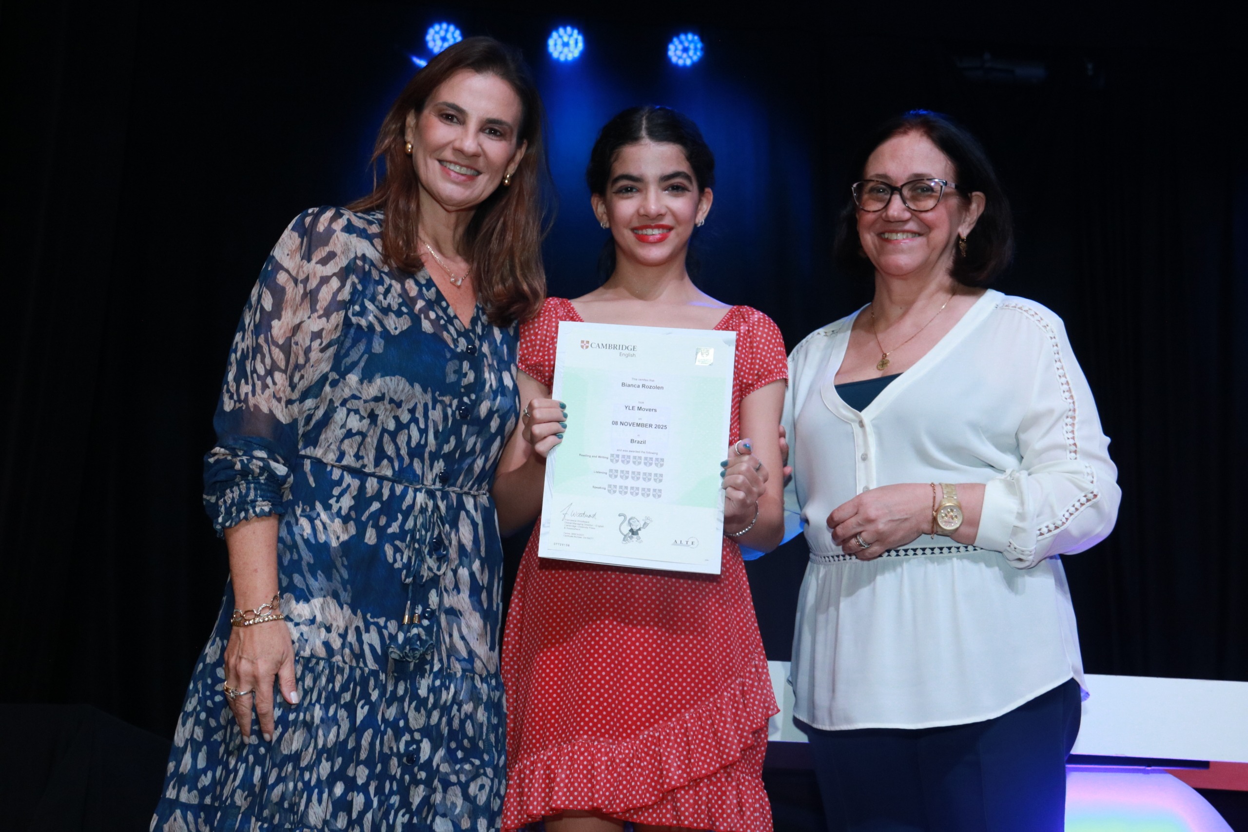No evento, cada aluno foi chamado ao palco e recebeu o merecido certificado das mãos da coordenadora-geral Patrícia e da convidada Fátima. Os participantes foram aprovados em diversas faixas etárias, dependendo de seu nível de inglês [veja a lista completa com o nome de todos no fim da página].