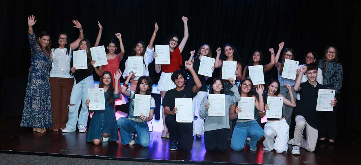 Em comemoração a essas novas certificações, esses jardanenses foram homenageados em uma cerimônia especial na Sala Professor Paulo Meinberg em nosso Teatro Jardim São Paulo. Além das famílias, representando o corpo docente do CJSP, estavam presentes os representantes da direção-geral — Maria de Fátima Lima de Carvalho e Patrícia Moretti Meinberg —, Kelly Barboza da Silva, coordenadora do programa bilíngue, e vários professores de Inglês do Jardão.