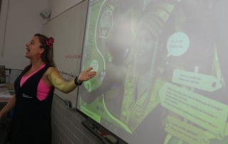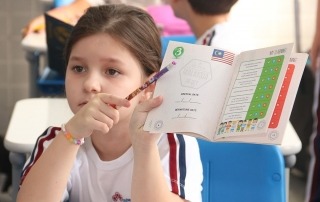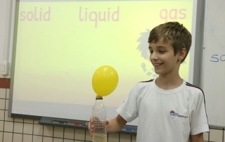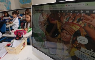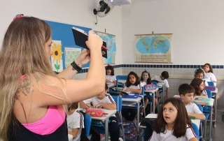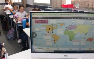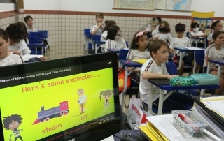 O programa de inglês também utiliza recursos digitais da escola — entre eles tablets e classes interativas em vários momentos ao longo da grade curricular semanal.